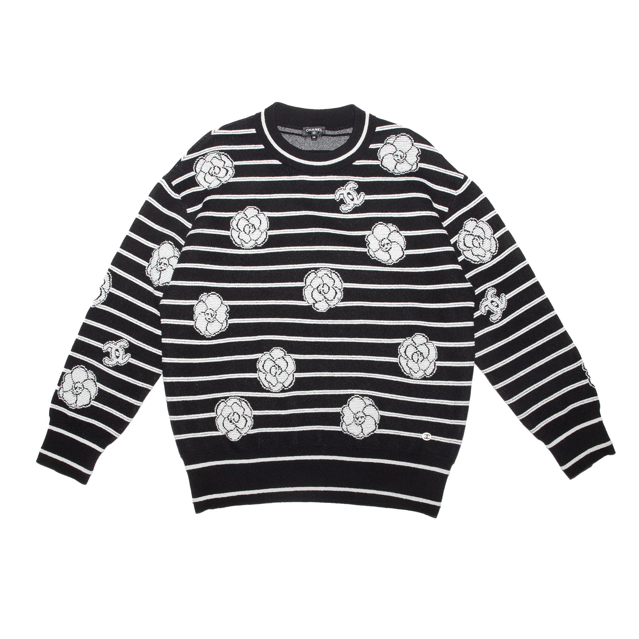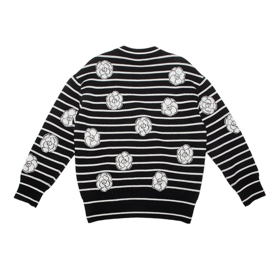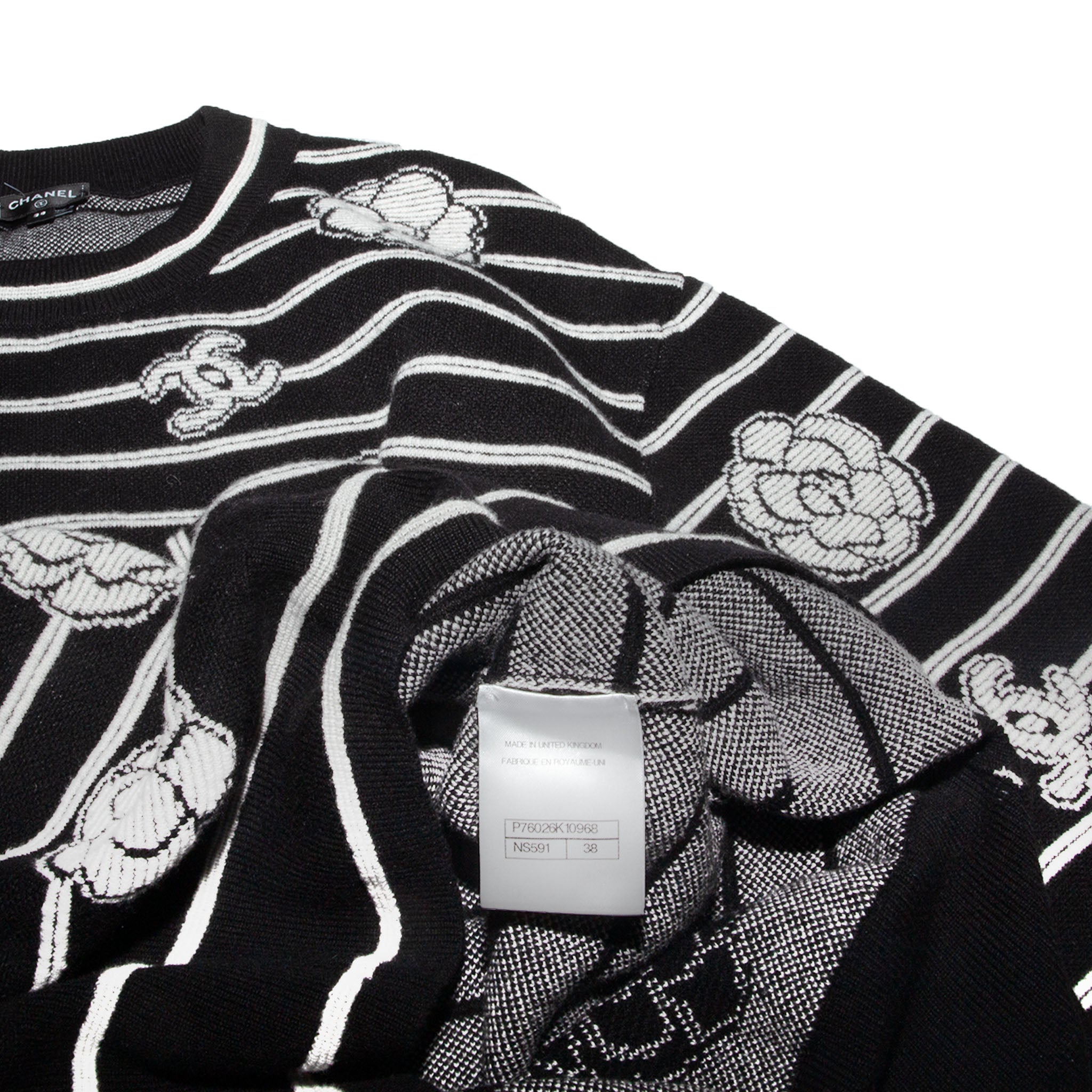 Authentic Chanel Camellia Striped Knit Crewneck Sweater – Black & White, Size 38