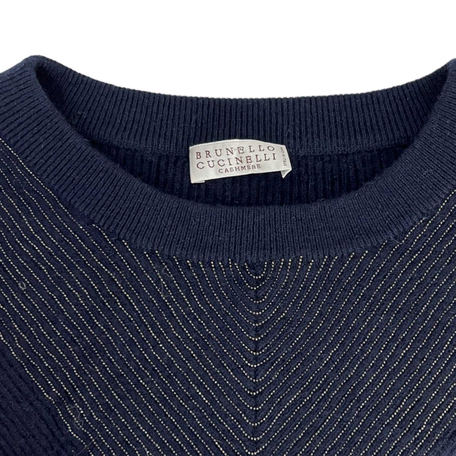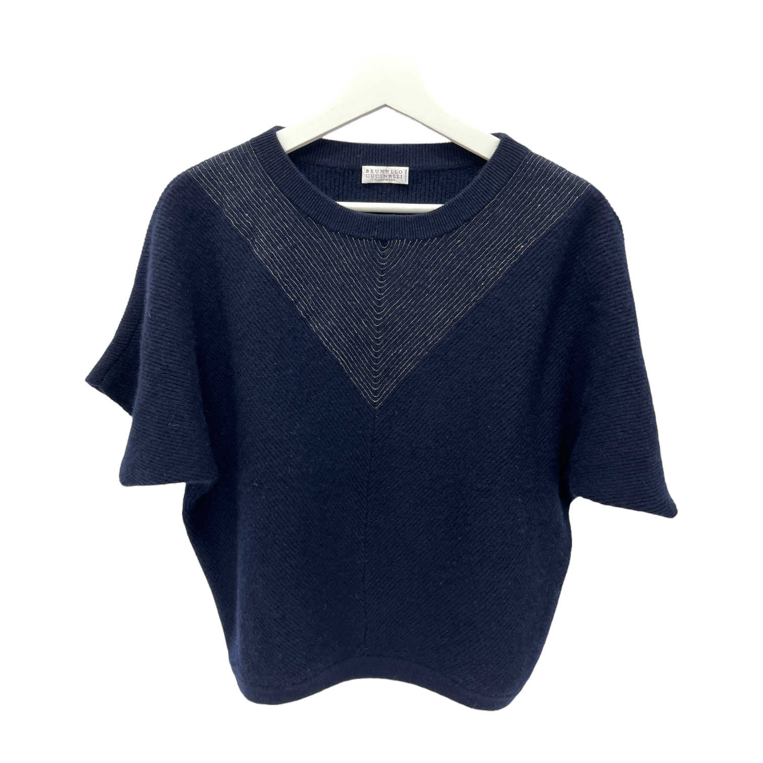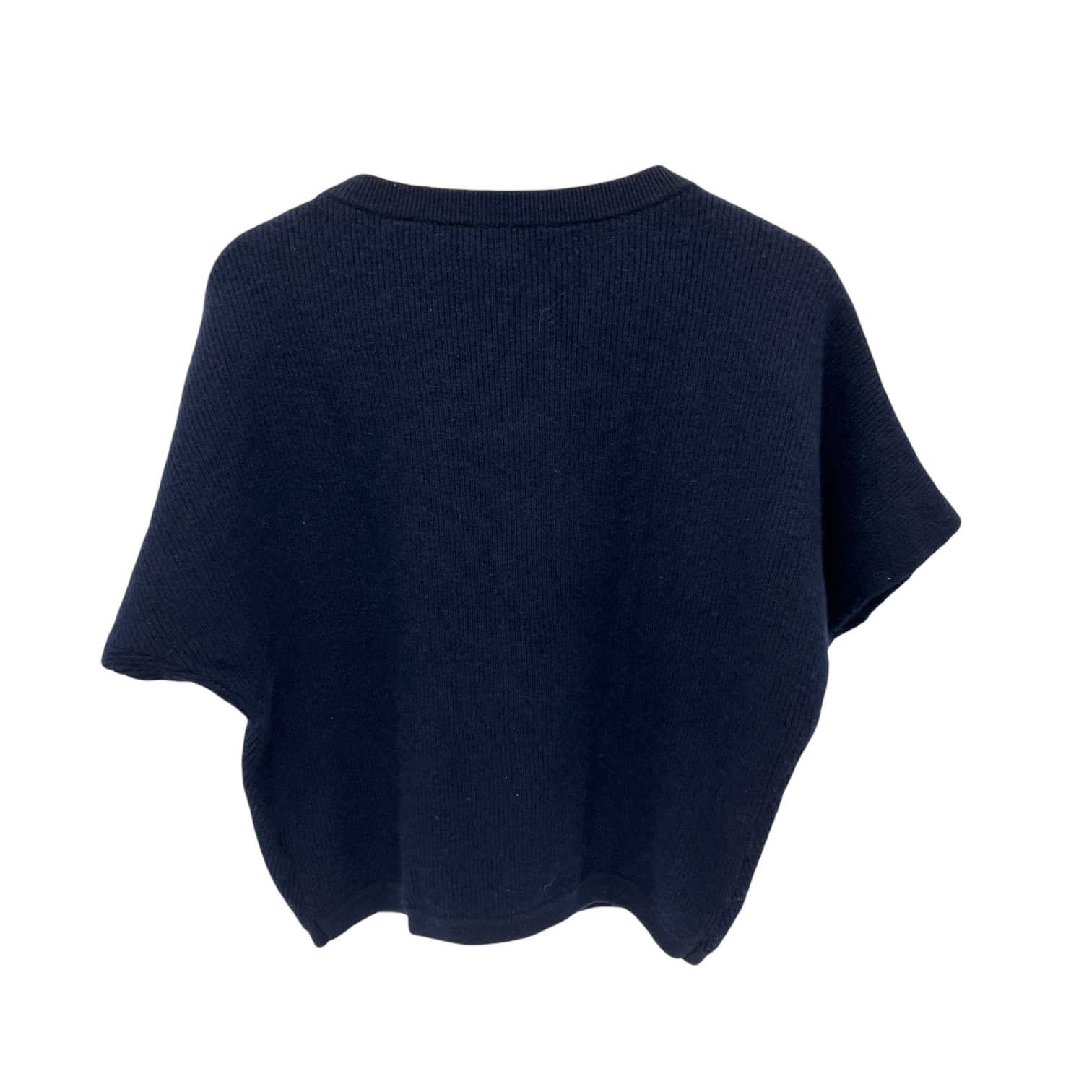 Navy short sleeve sweater with V-shape bead embellishments at neck. V-shaped rib knit. Relaxed fit.