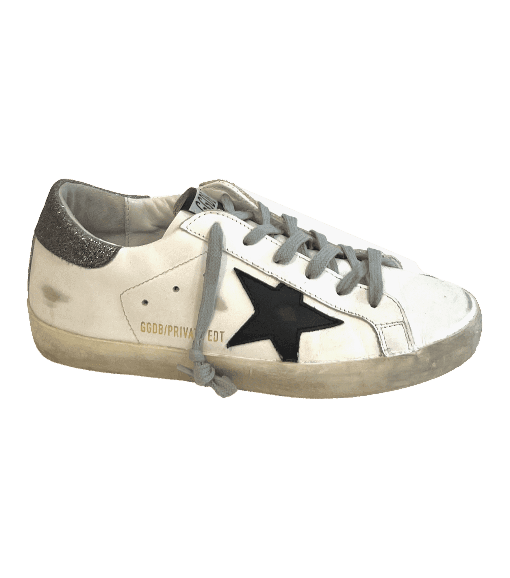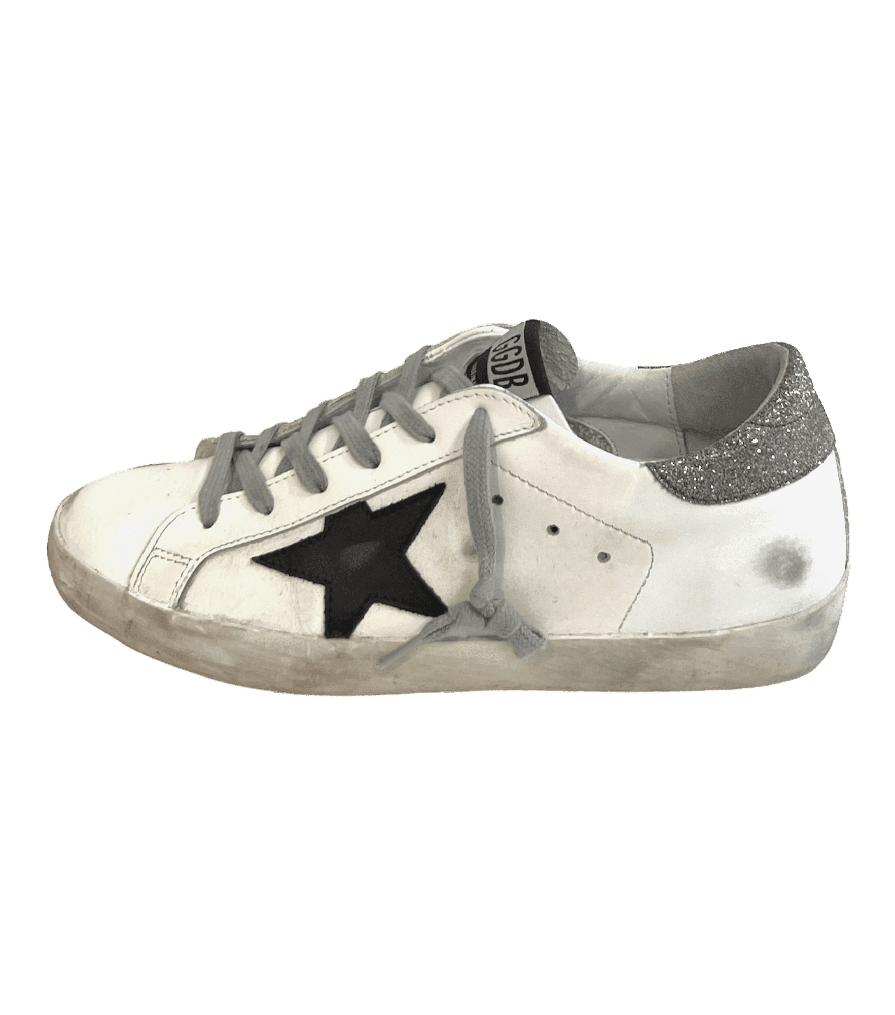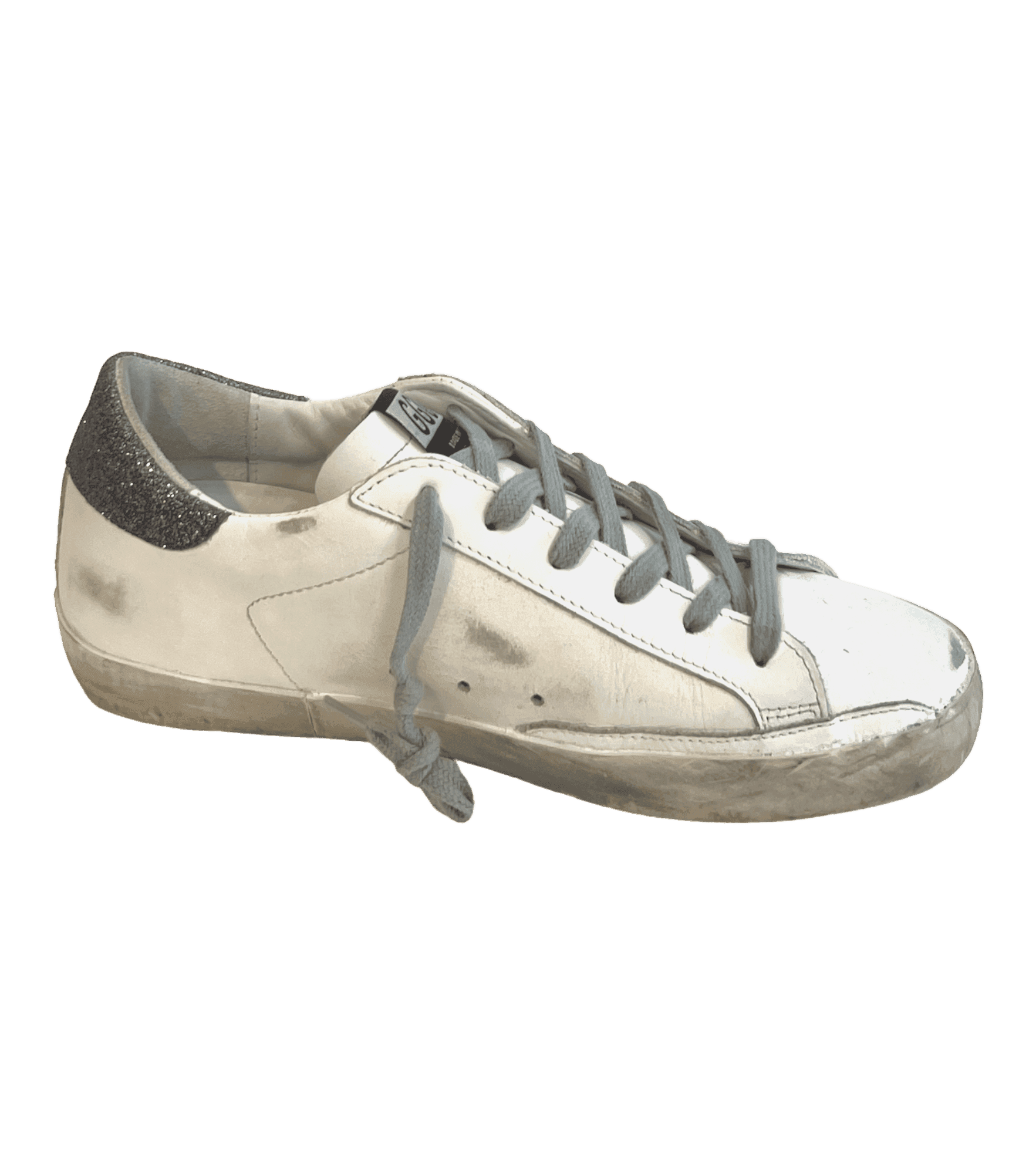 White leather sneakers with the Golden Goose pre-scuffed finish. Black leather star and silver glitter heel tab.