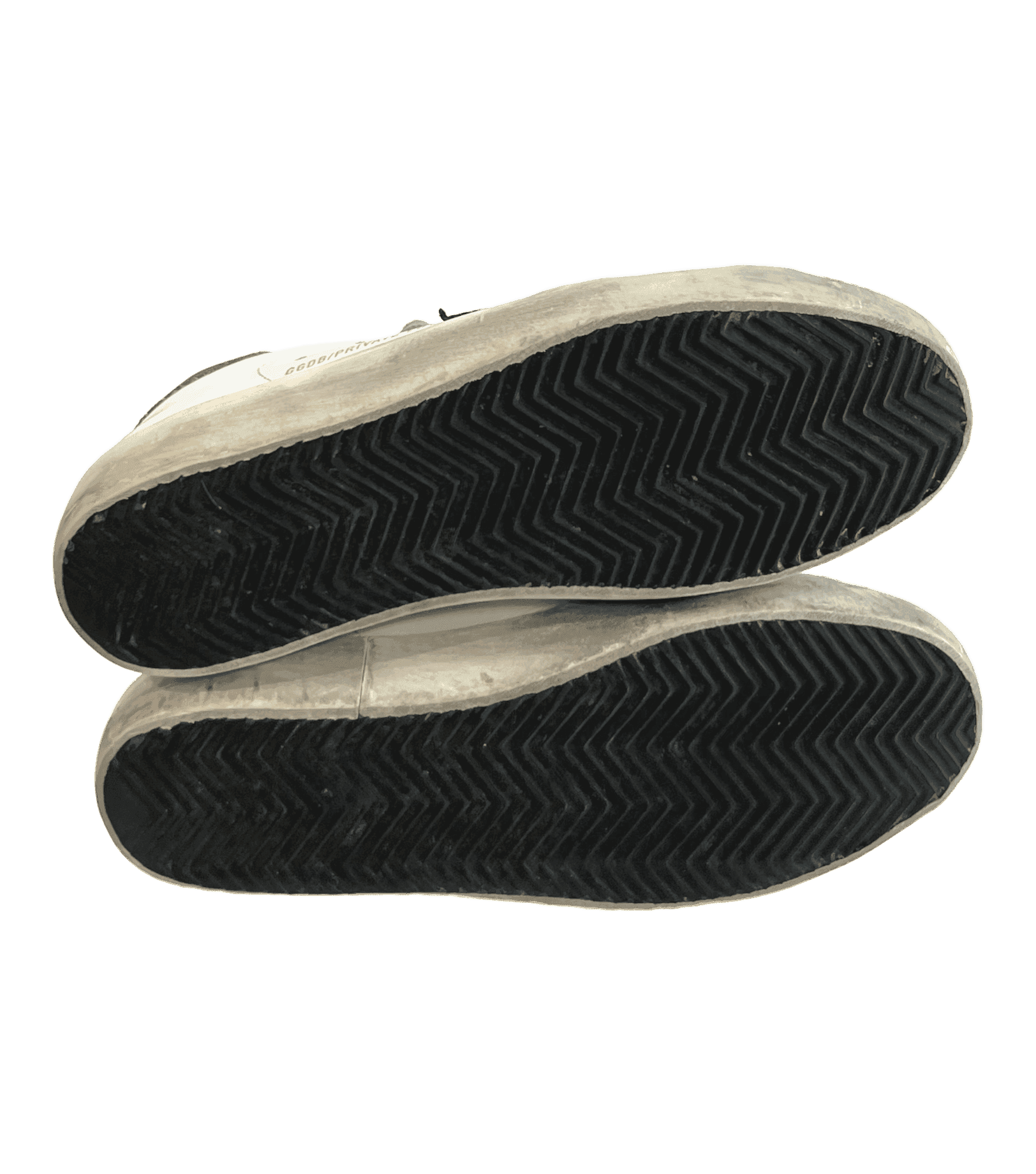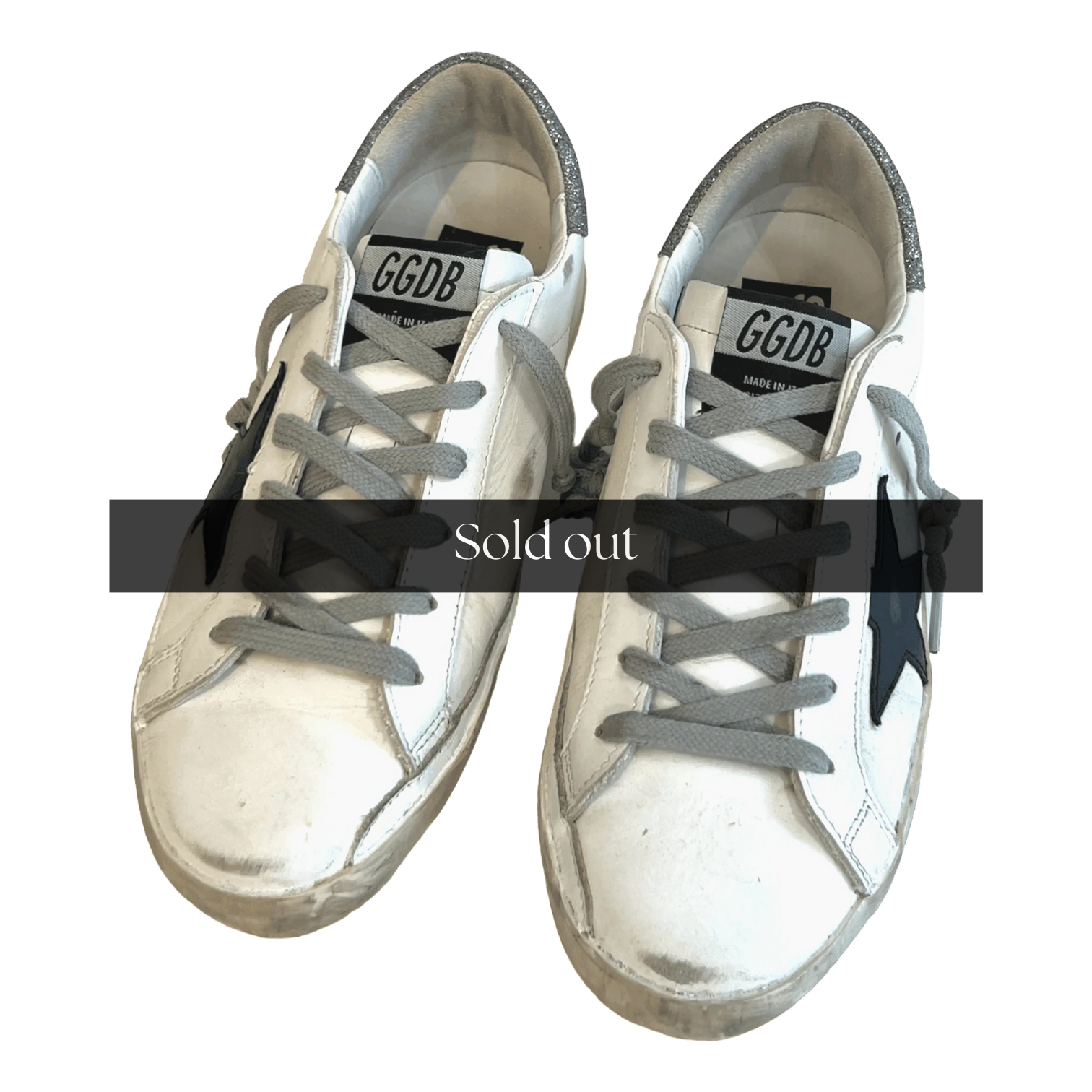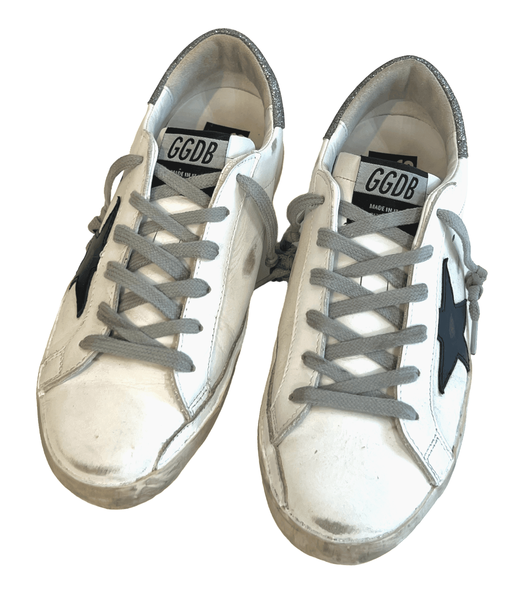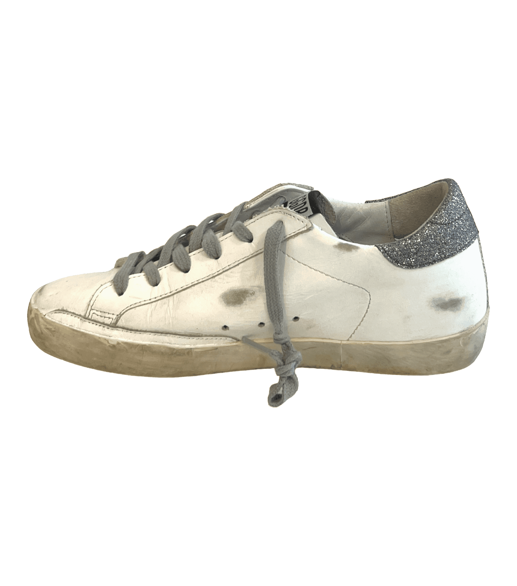 White leather sneakers with the Golden Goose pre-scuffed finish. Black leather star and silver glitter heel tab.