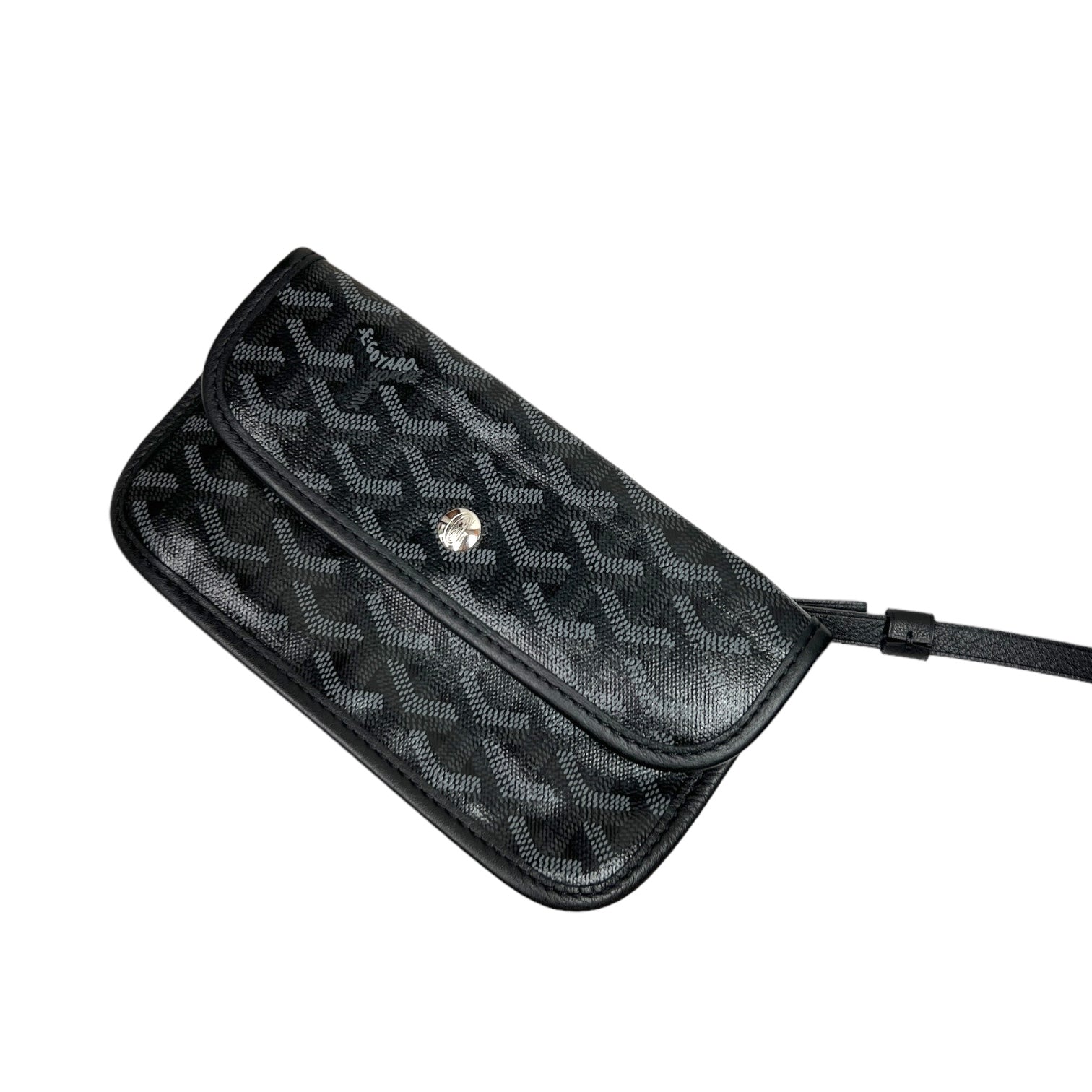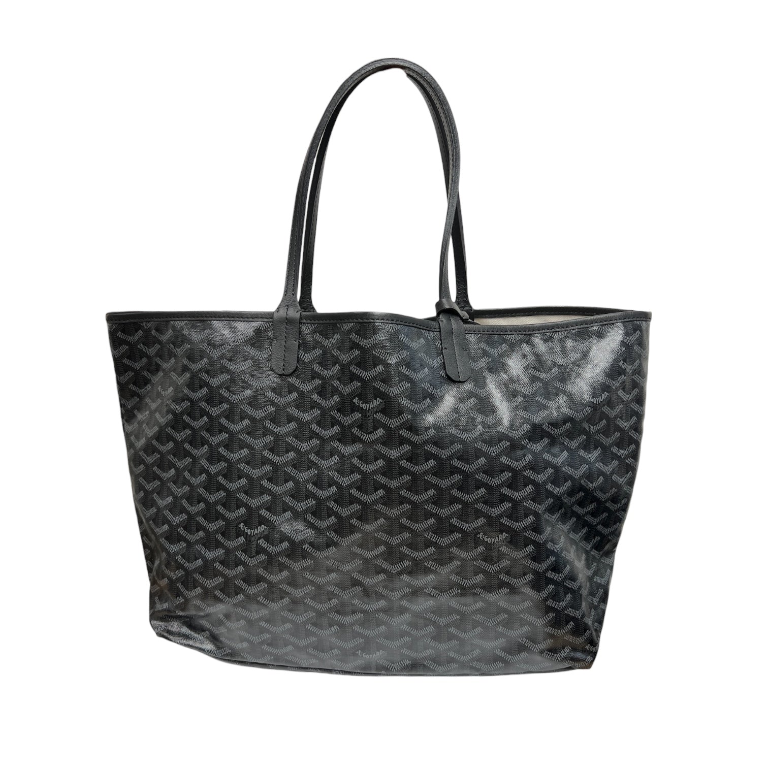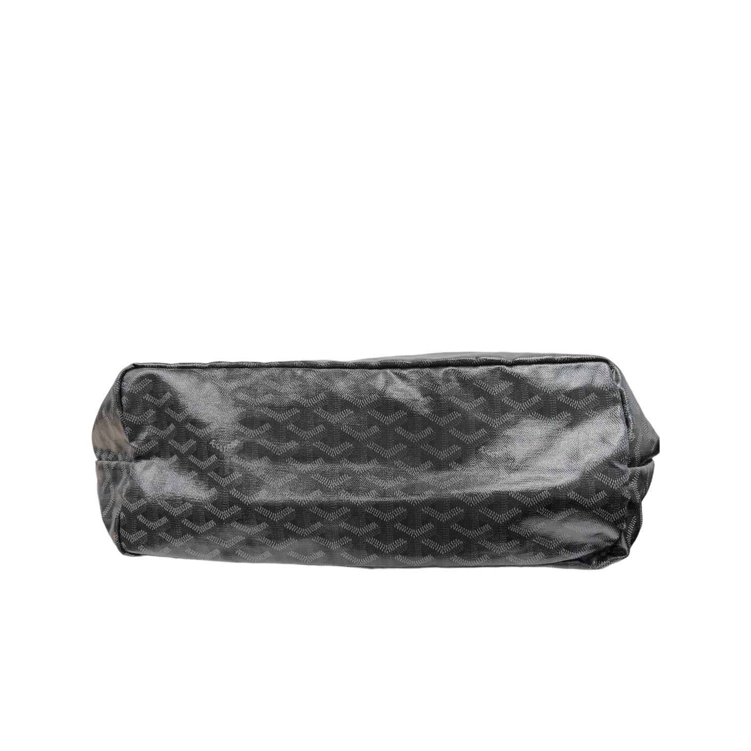 Double handle tote bag in signature grey Goyardine monogram canvas. Unlined interior. Snap button pouch attached to handle.