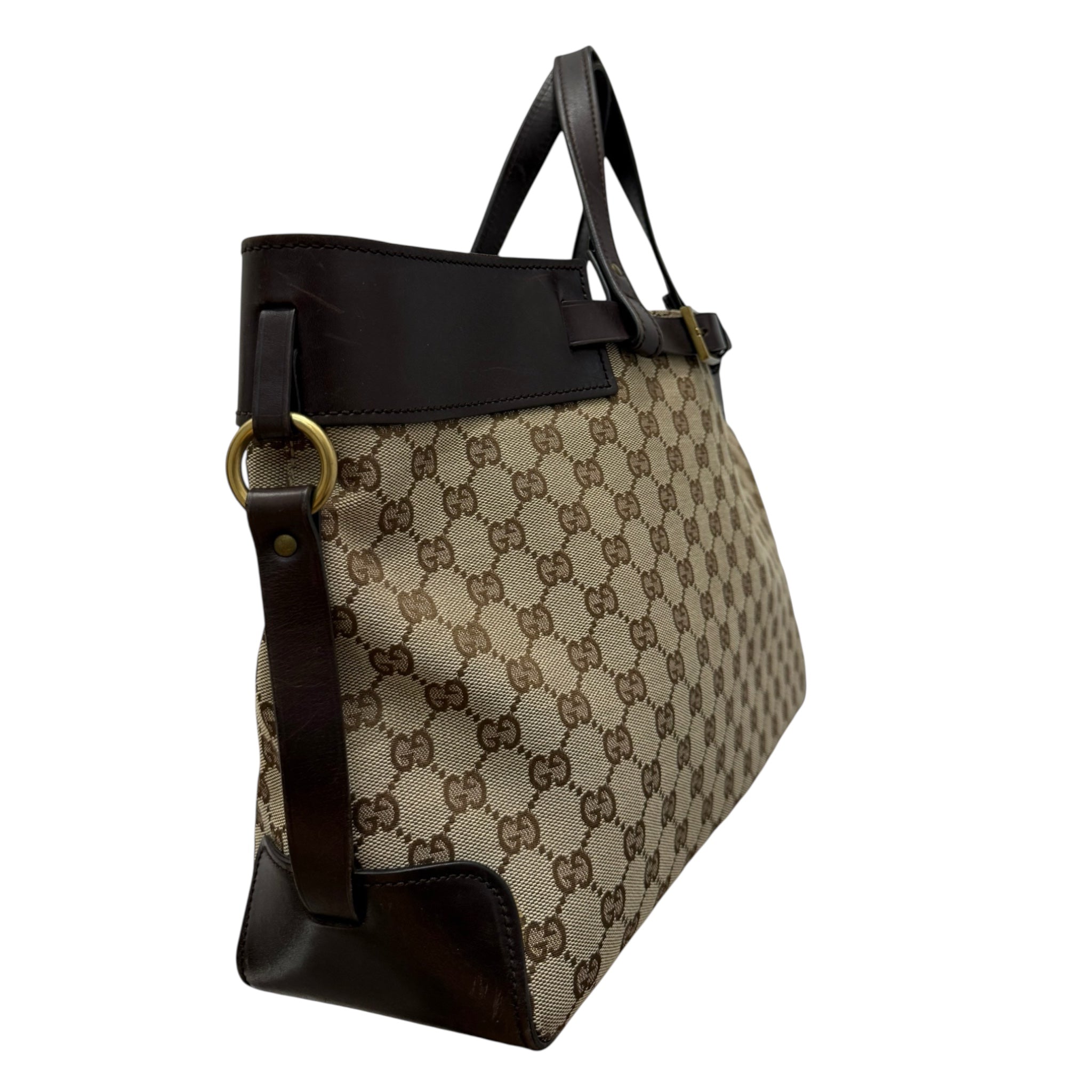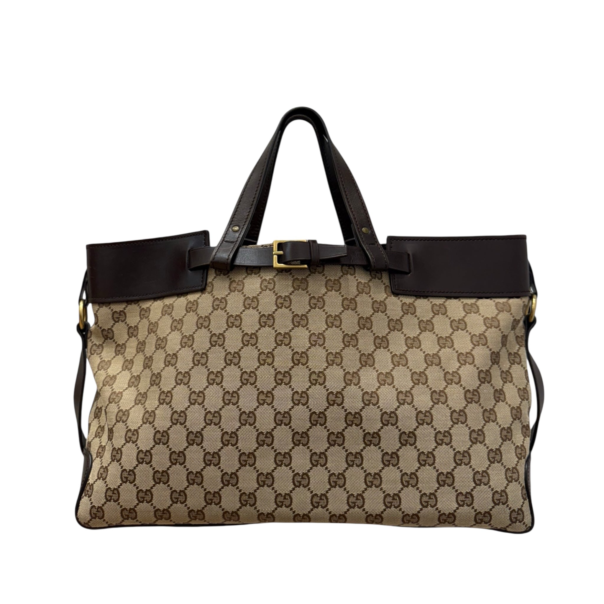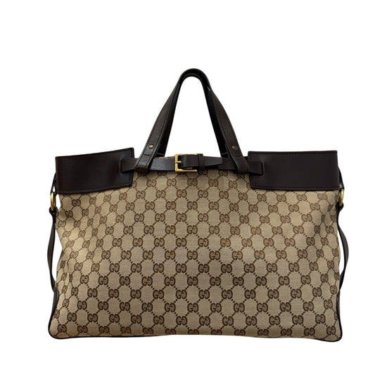 Gucci GG Supreme Canvas and Leather Tote – Vintage Monogram Top Handle Bag with Gold Buckle Belt Detail