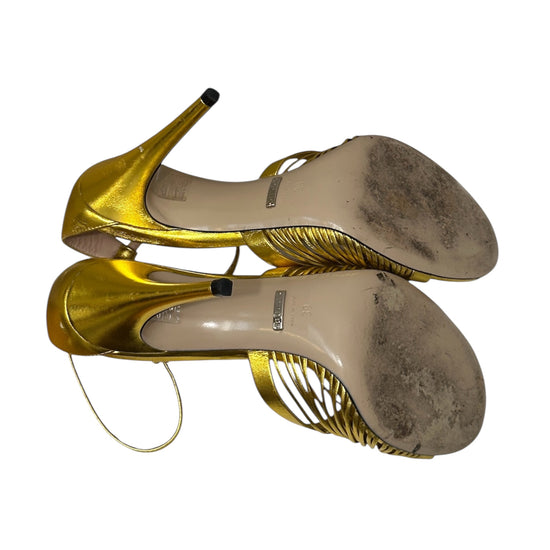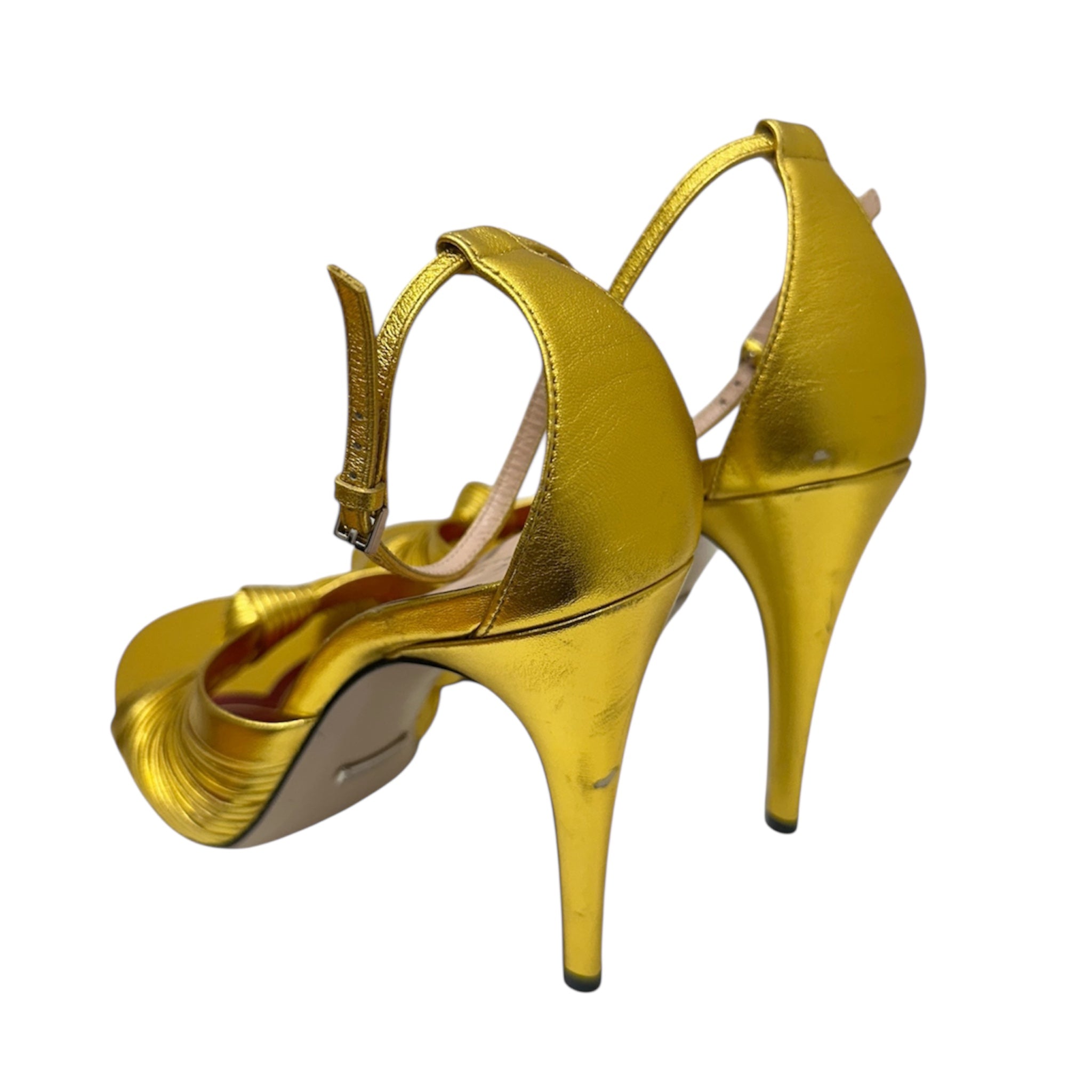 Gucci Metallic Gold Strappy High Heel Sandals – Knot Detail Ankle Strap Heels | Designer Statement Shoes Made in Italy – Size 39