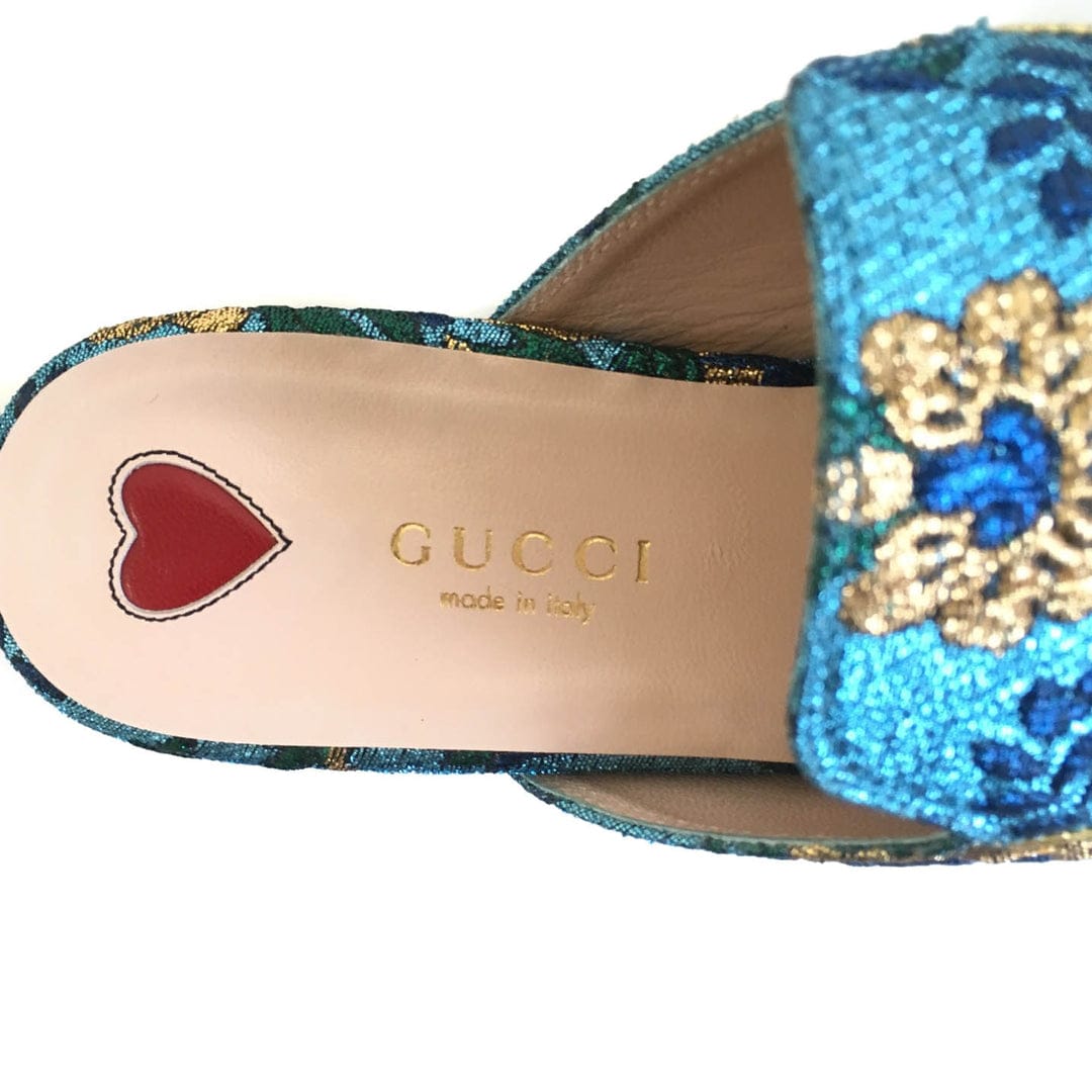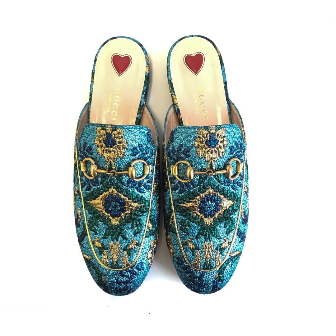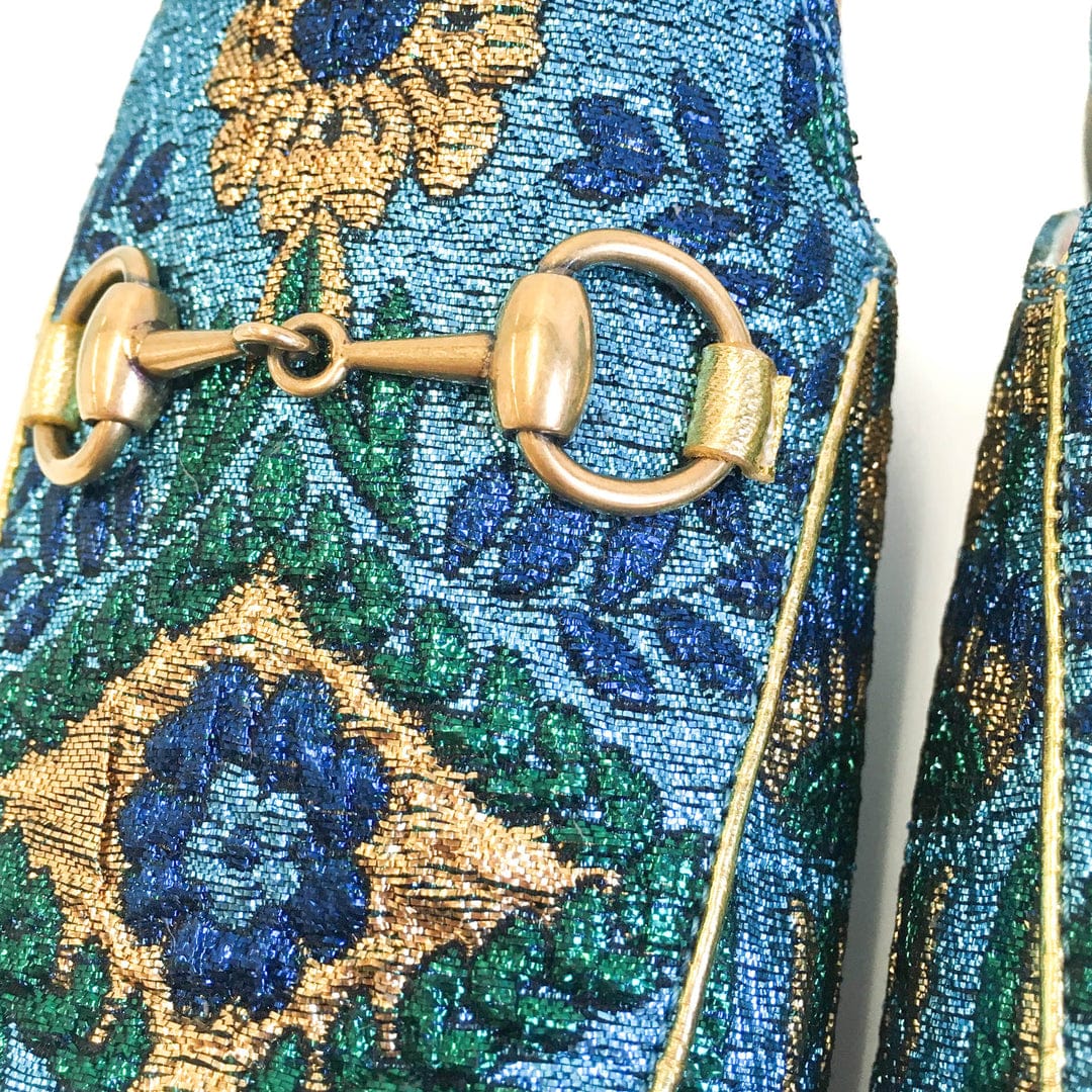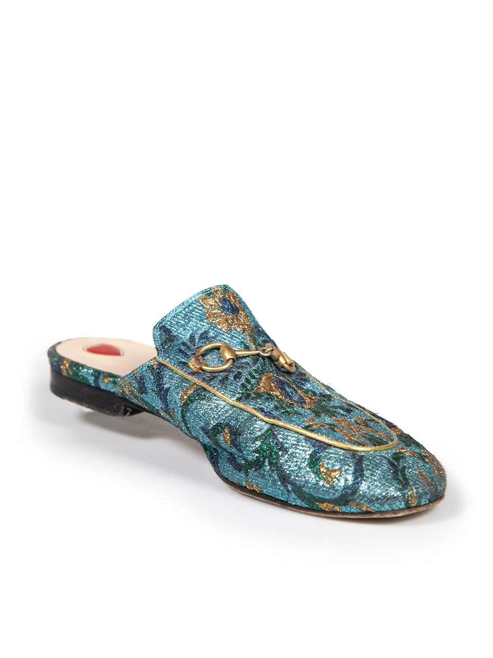 This is an authentic pair of GUCCI Iridescent Brocade Princetown Slippers size 37.5 in Azure, Multicolor and Oro. These stylish loafers are crafted of iridescent metallic fabric in multicolor. They feature an aged brass horsebit embellishment at the top of the shoe, a rounded toe with gold leather piping and a 0.25 inch heel. These have a unique look for the right occasion, from Gucci.