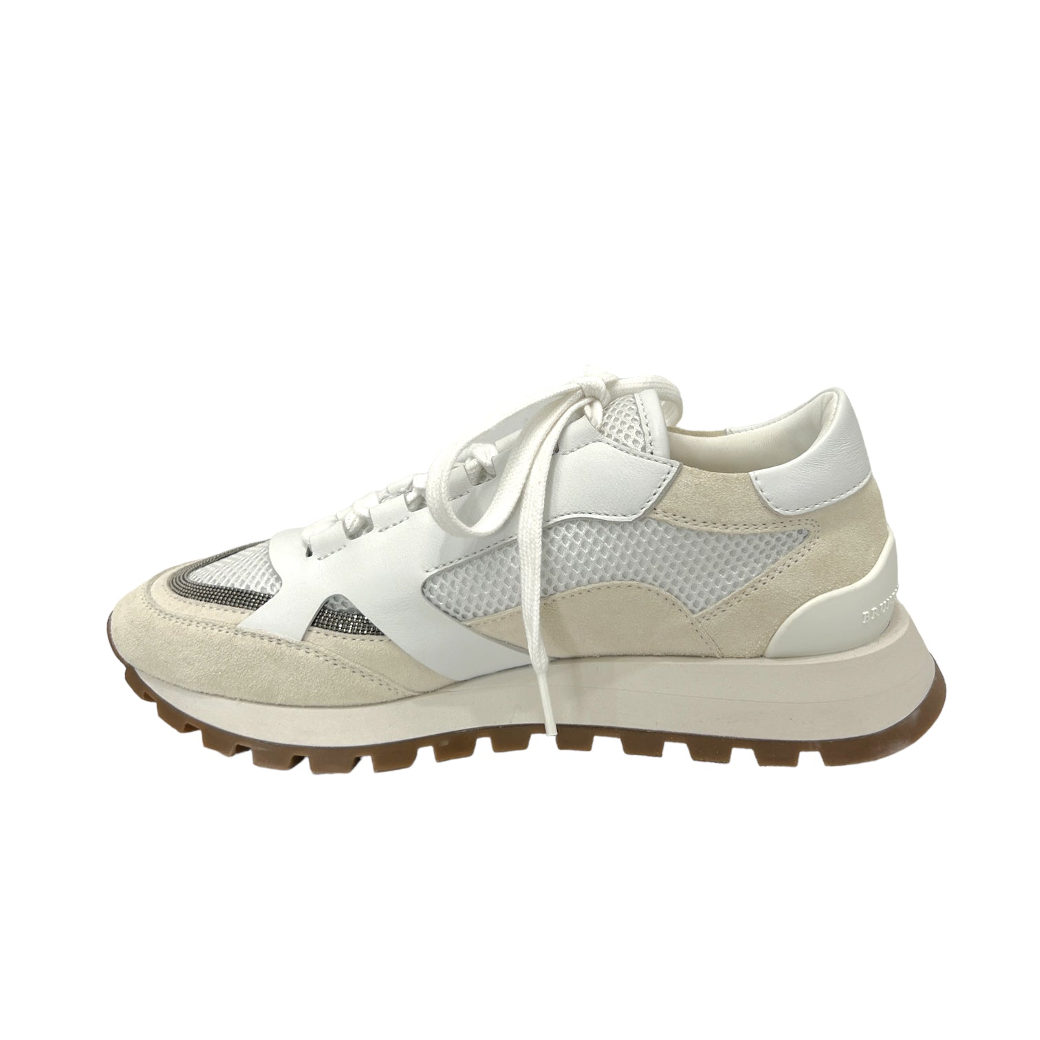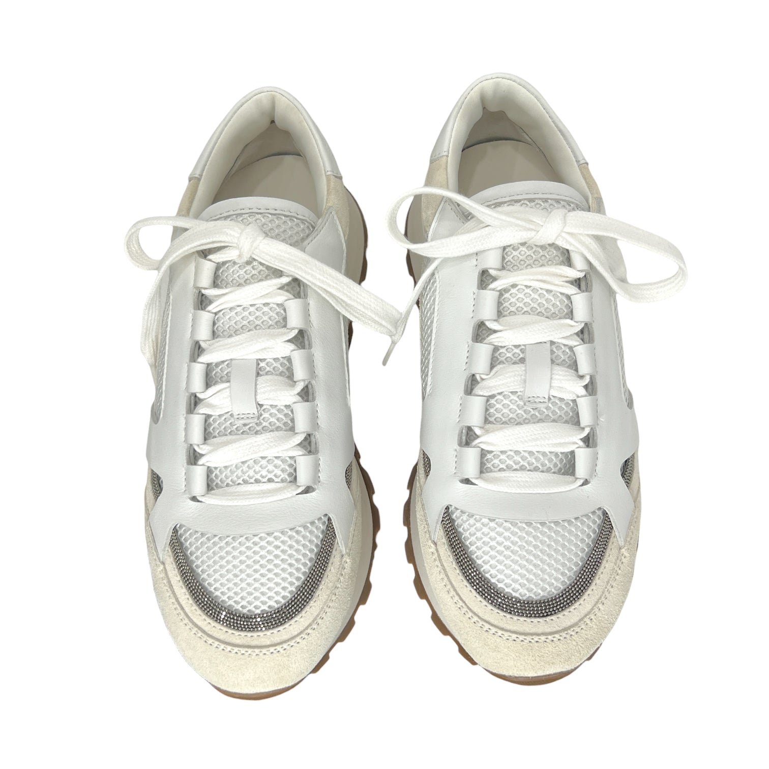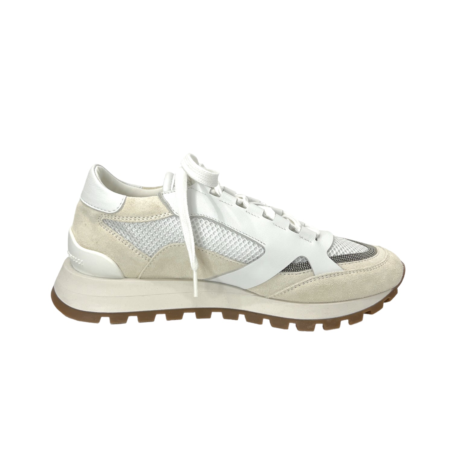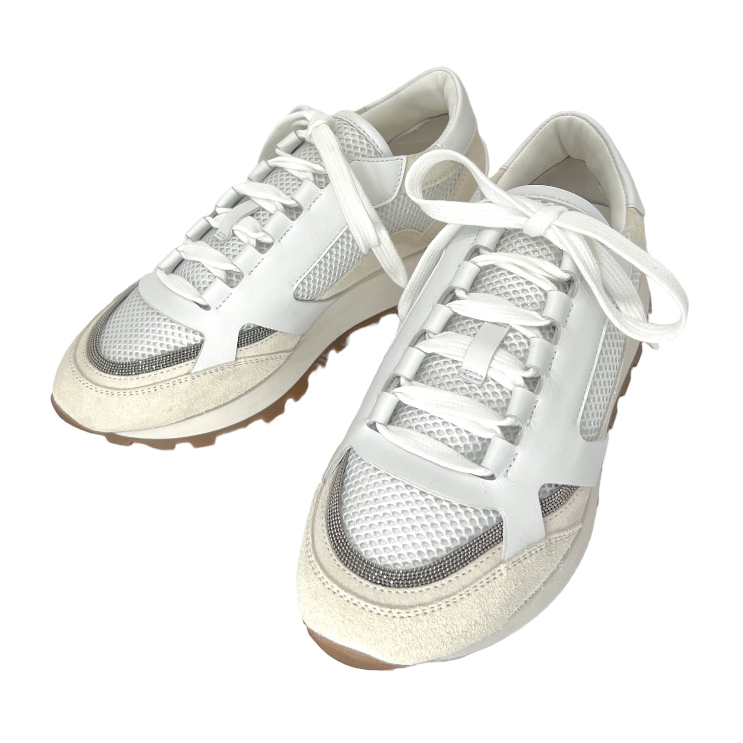 White/off-white sneakers with contrasting suede and textile paneling. Signature monili embellishment at toe area. White laces.