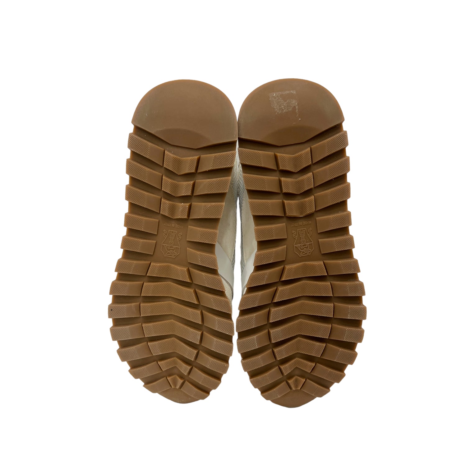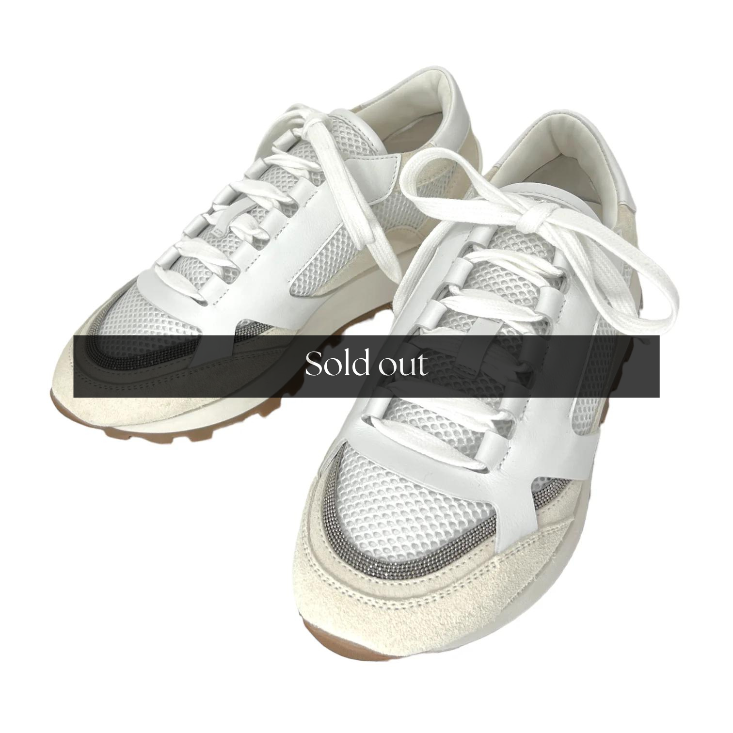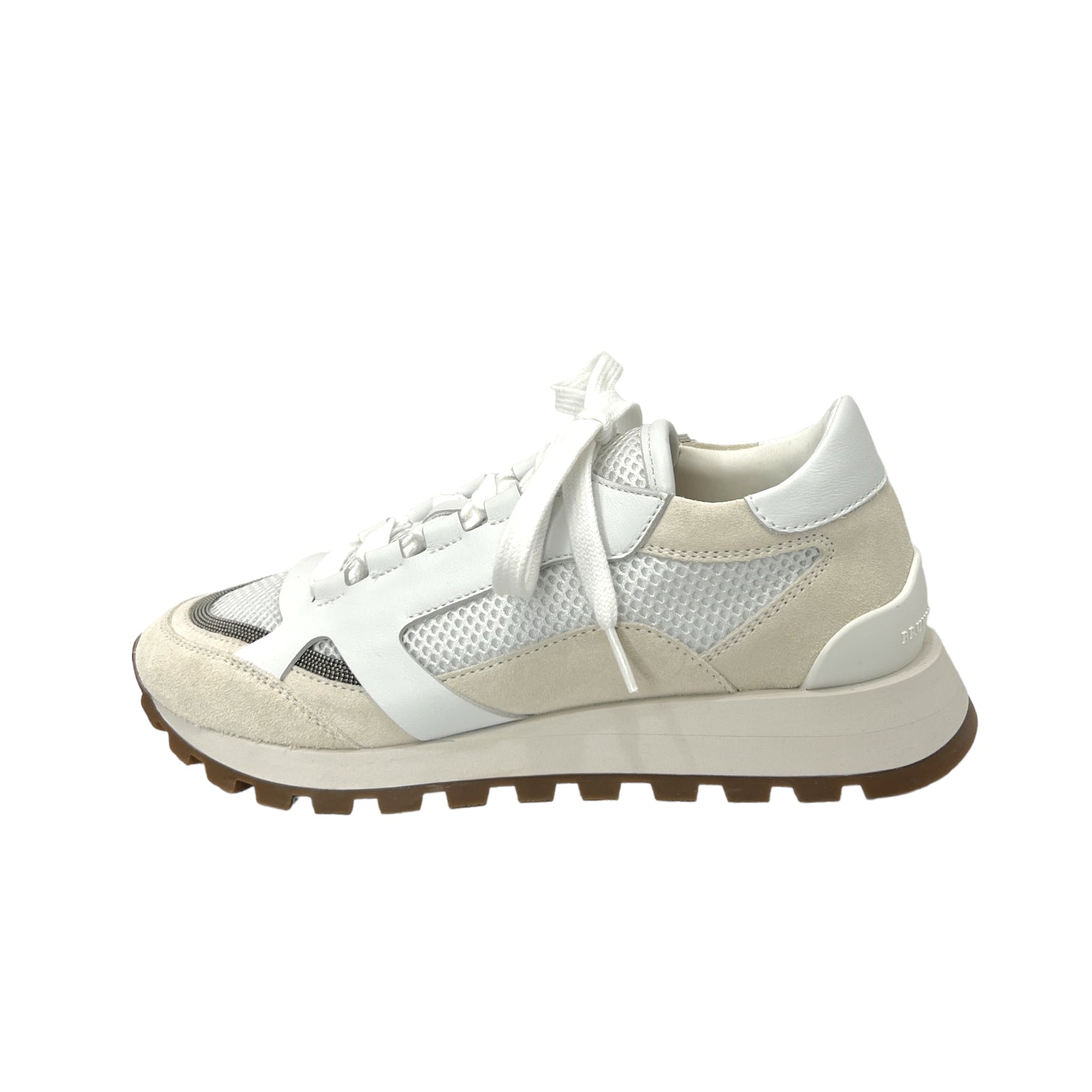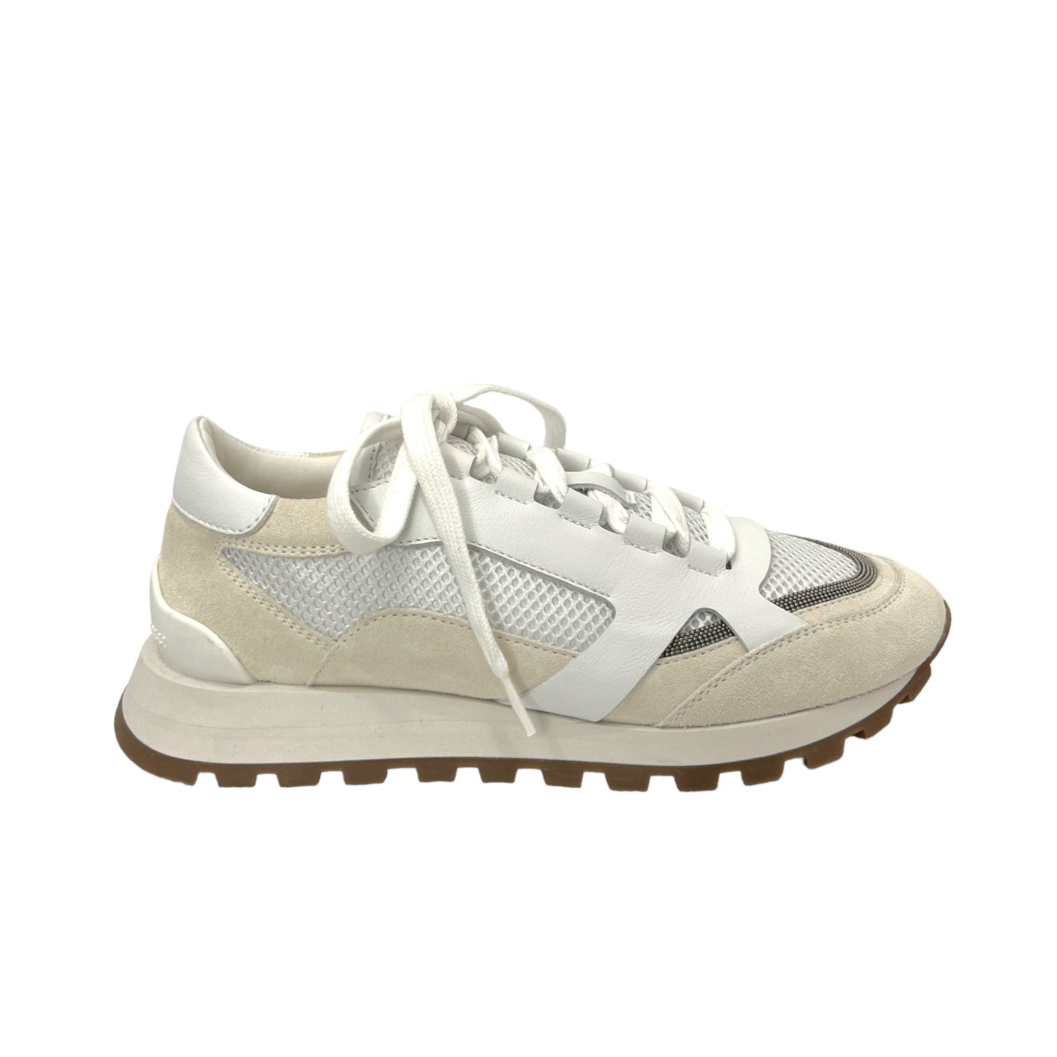 White/off-white sneakers with contrasting suede and textile paneling. Signature monili embellishment at toe area. White laces.
