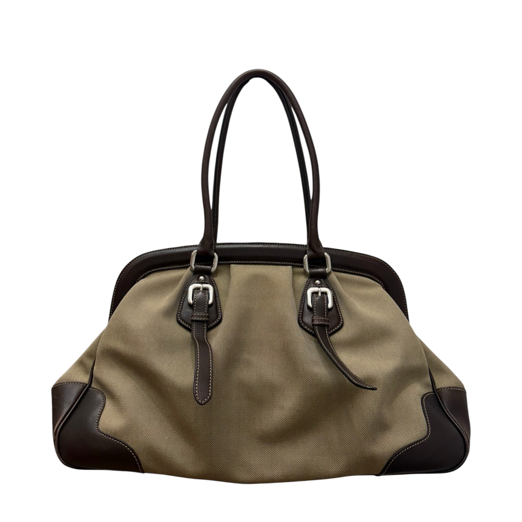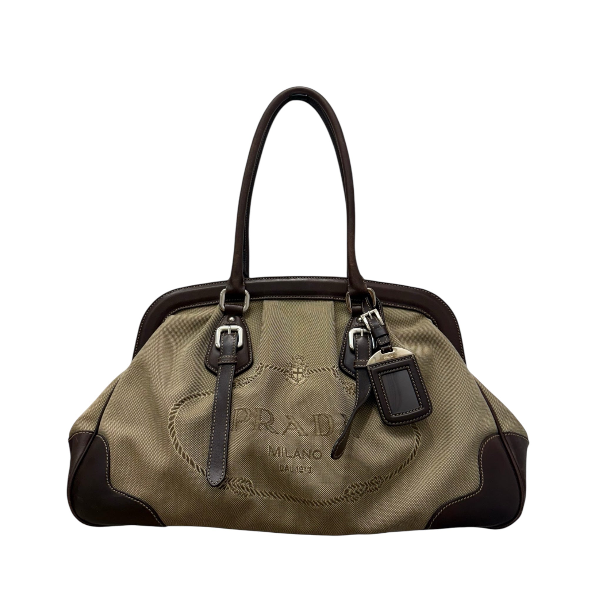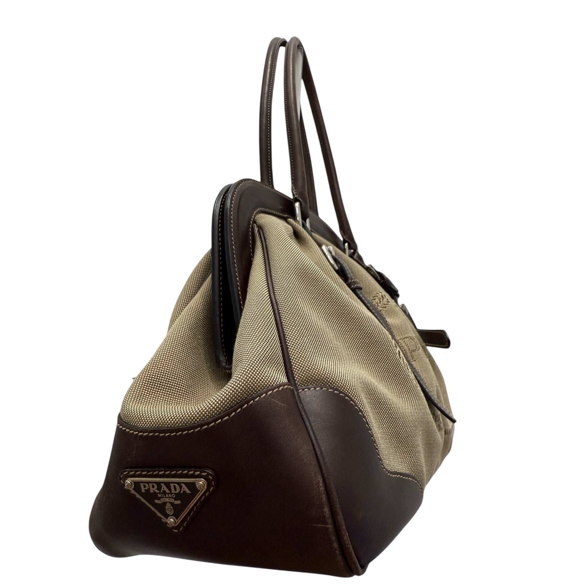 Prada Milano Canvas and Leather Tote Bag – Structured Beige & Brown Satchel with Embroidered Logo | Made in Italy