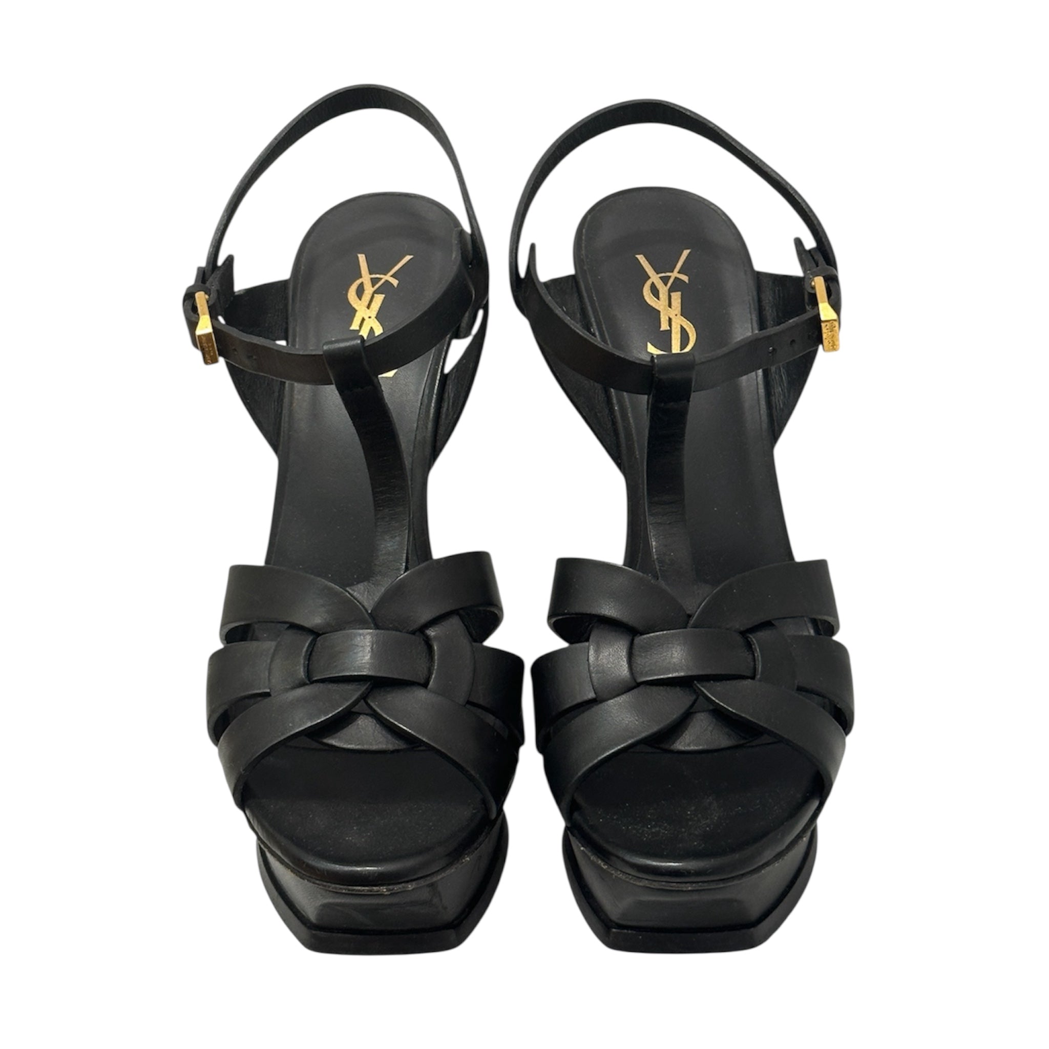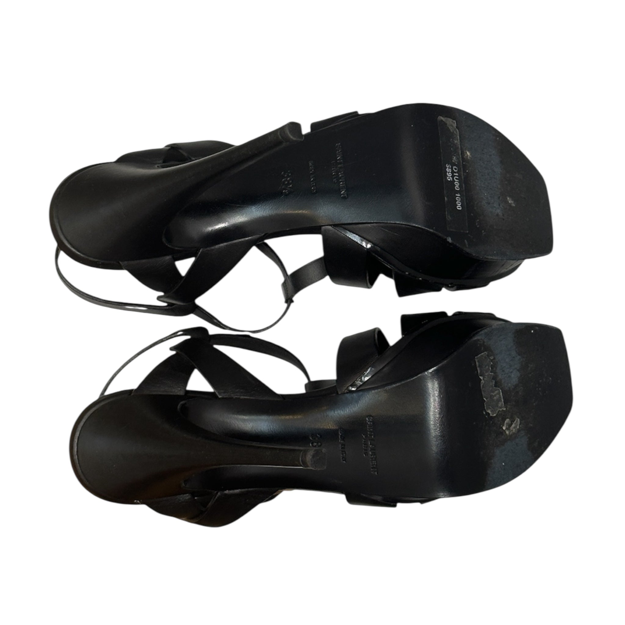 Yves Saint Laurent Tribute Platform Sandals – Black Leather Strappy Heels | Iconic YSL Designer Shoes – Size 38.5